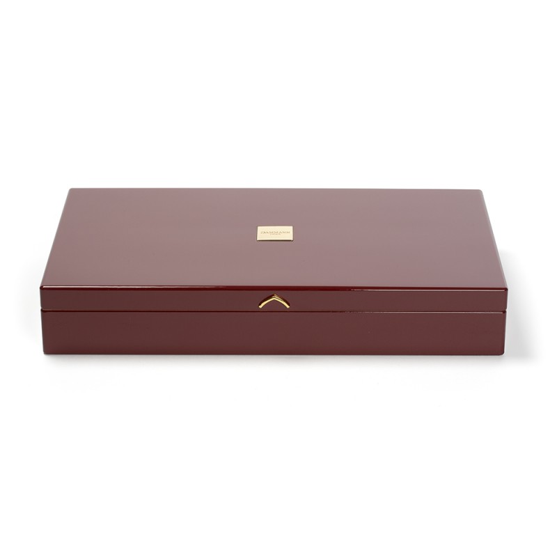 Questo scrigno per tè pregiato Dammann Frères vanta rifiniture di grande qualità. L'esterno è in legno laccato di un raffinato color rosso, mentre l'interno, invece, è di un bellissimo color legno naturale. Il coperchio è abbellito da una placchetta d'ottone.