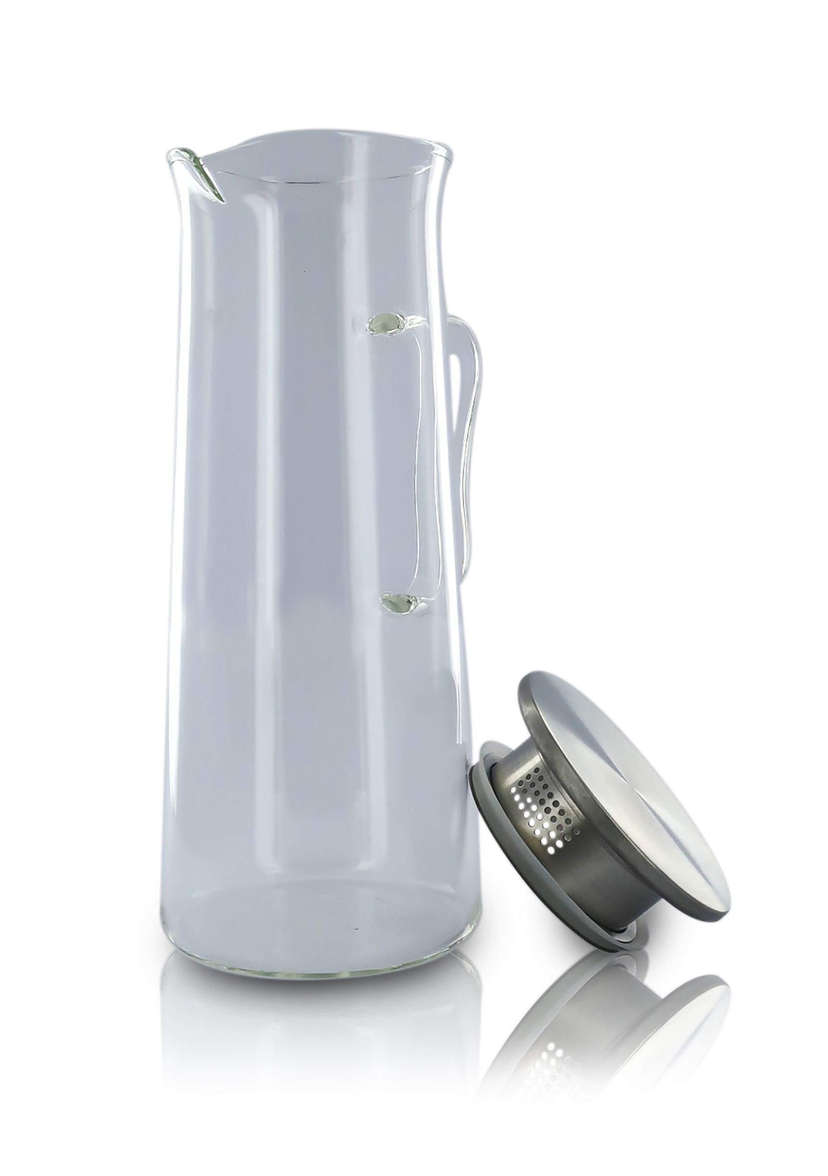 Di forma allungata e dalle linee moderne, la caraffa non è solo bella da sfoggiare in tavola, ma è anche molto comoda da usare grazie al manico di design e al tappo filtrante. Infatti, questa caraffa è perfetta per la preparazione a freddo d'infusi o di tè freddi, essendo dotata di un coperchio in acciaio inossidabile spazzolato con un'apertura che, grazie ai forellini presenti, consente di filtrare il liquido contenuto, trattenendo i pezzi di frutta, foglie o zenzero precedentemente messi in infusione.